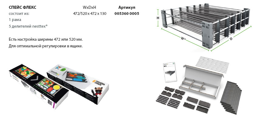 Спейс Флекс состоит из рамы и пяти гибких эластичных делителей nesttex®, легко адаптирующихся под размер и форму предметов.Подвижные ограничители и инновационный материал позволяют хранить в любых ящиках все, что мы пожелаем. При этом все предметы будут оставаться на своих местах. Оптимальный обзор достигается благодаря наличию в перегородках прозрачных зон.
