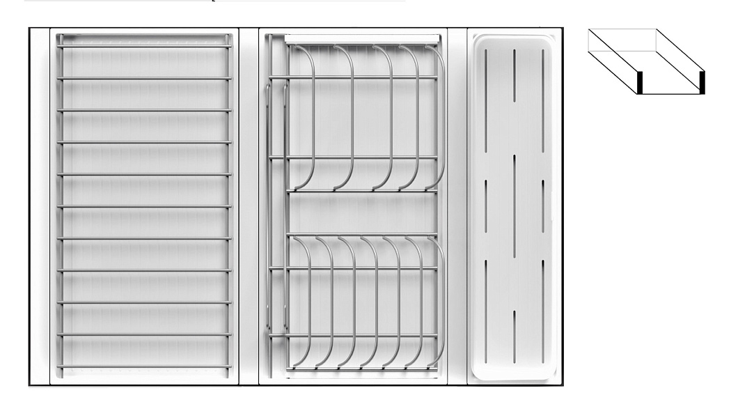 1 для столовых приборов (состоит из: 1 х емкость пластиковая 400 х 100 х 120 мм, 1 х поддон пластиковый 423 х 124 мм)