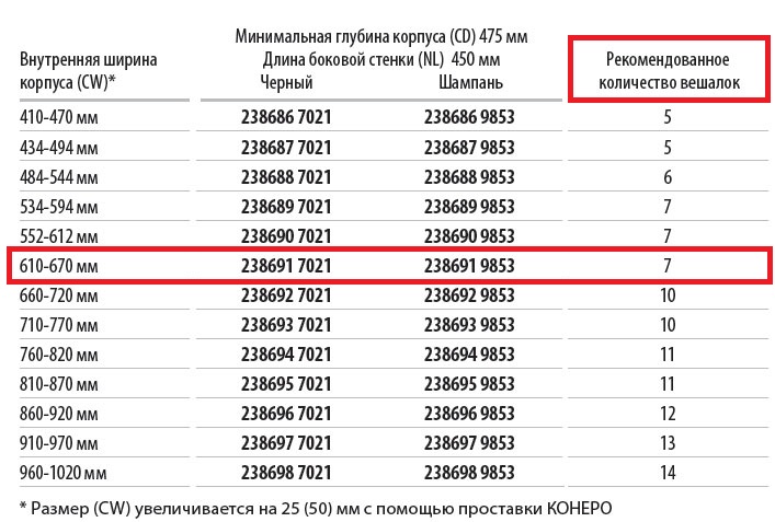 Размер (CW) увеличивается на 25 (50) мм с помощью проставки КОНЕРО