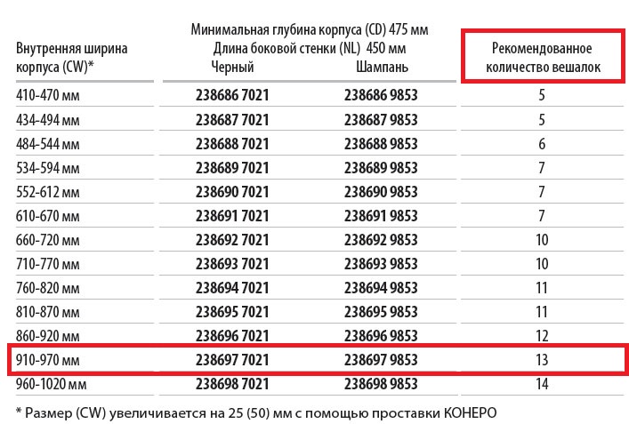 Размер (CW) увеличивается на 25 (50) мм с помощью проставки КОНЕРО