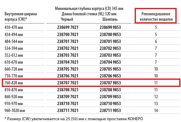Размер (CW) увеличивается на 25 (50) мм с помощью проставки КОНЕРО