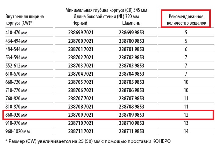 Размер (CW) увеличивается на 25 (50) мм с помощью проставки КОНЕРО