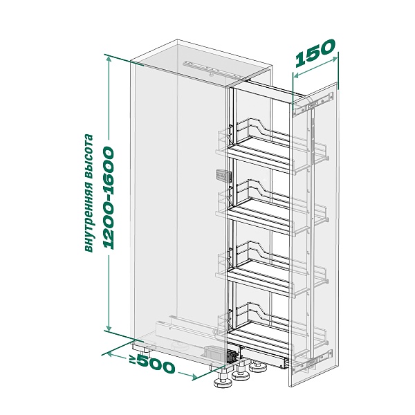 • Высокая нагрузка на механизм в 100 кг (по 18 кг на полку) позволяет организовать хранение большому количеству предметов, при этом даже при полной загрузке система выдвигается легко.